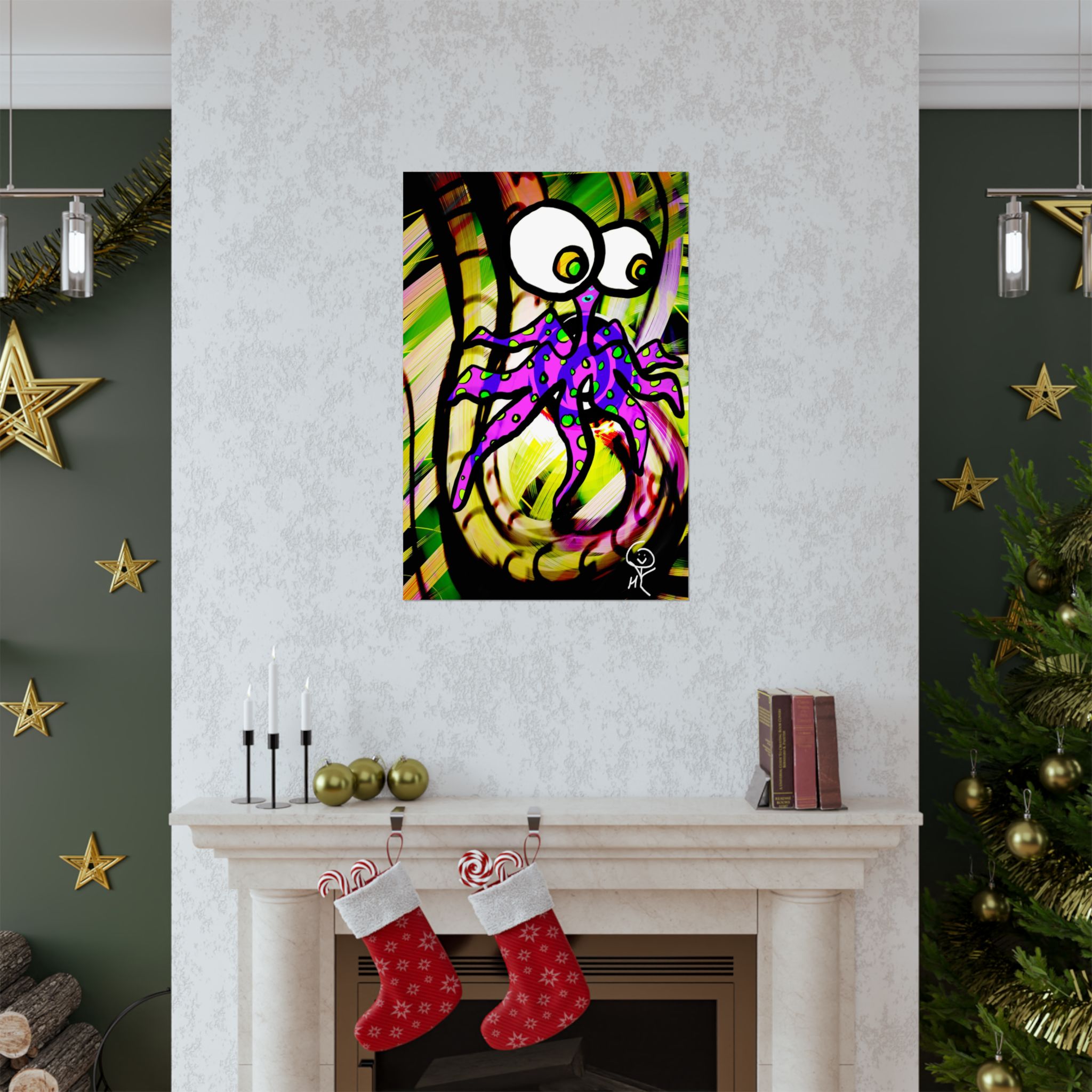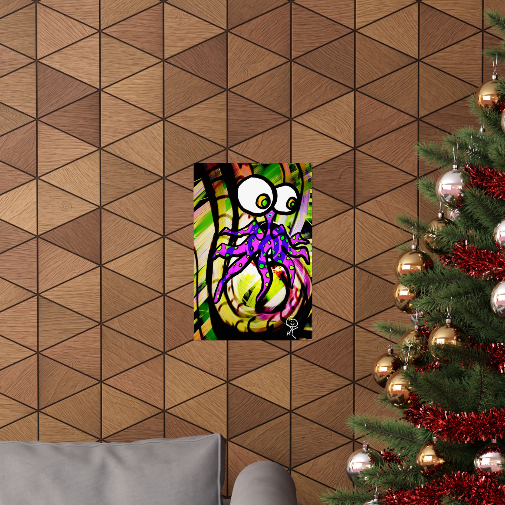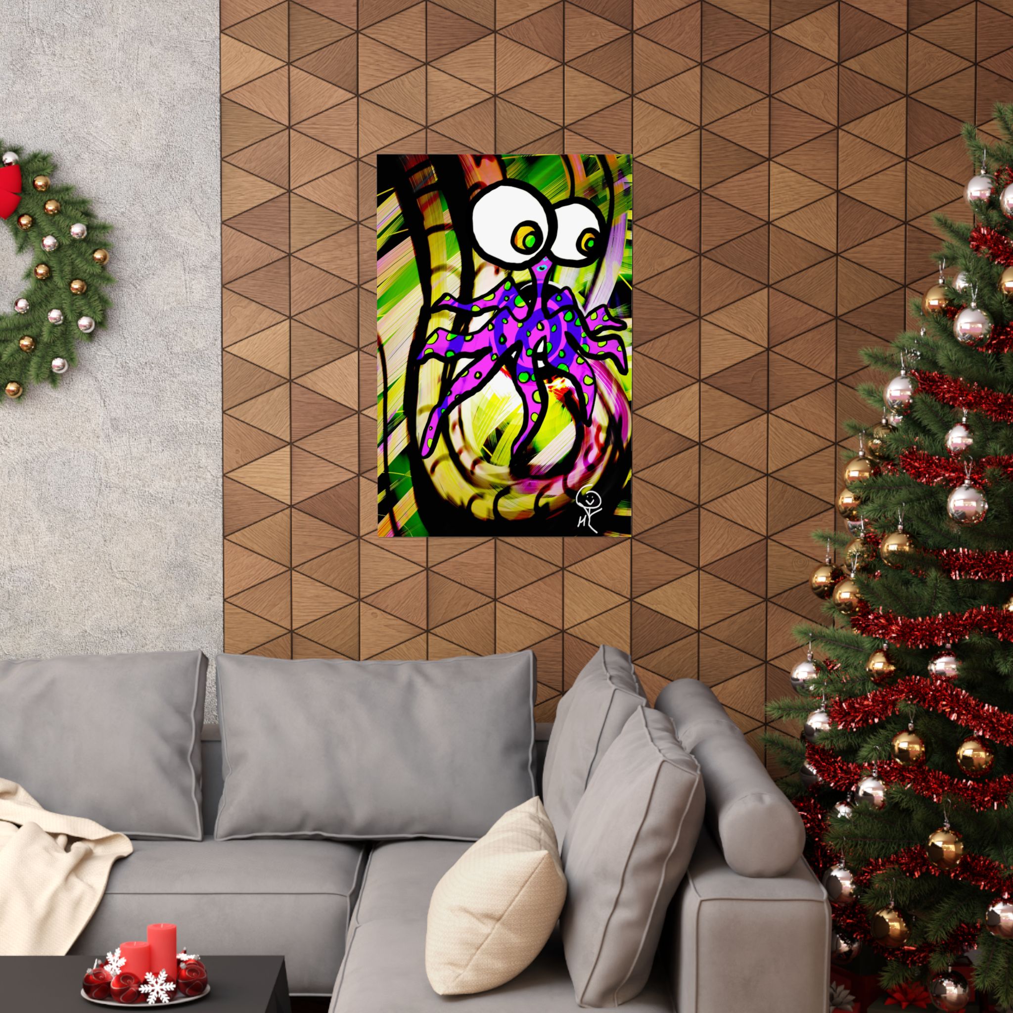 A vibrant matte poster that brings playful surrealism to your walls. Printed on museum-grade archival paper using giclée techniques, the artwork bursts with saturated colors and crisp detail while the matte finish softens glare. The design — a wide-eyed, purple octopus-like creature set against swirling greens and yellows — feels energetic, whimsical, and a little mischievous. It livens up creative corners, studios, or reading nooks and holds its color over time for indoor displays. Available in many sizes, this poster works well where bold, quirky art is welcome and where archival-quality print matters.