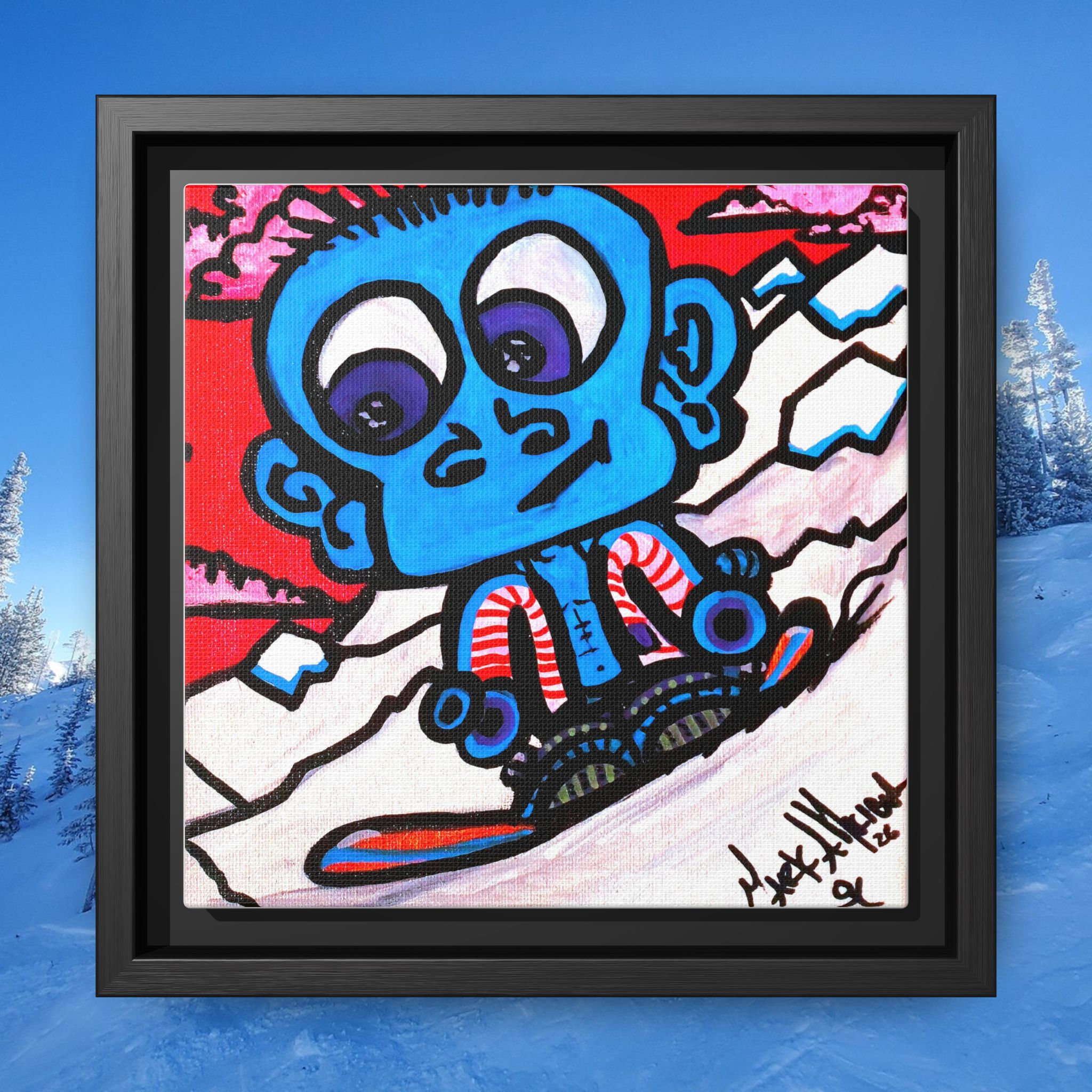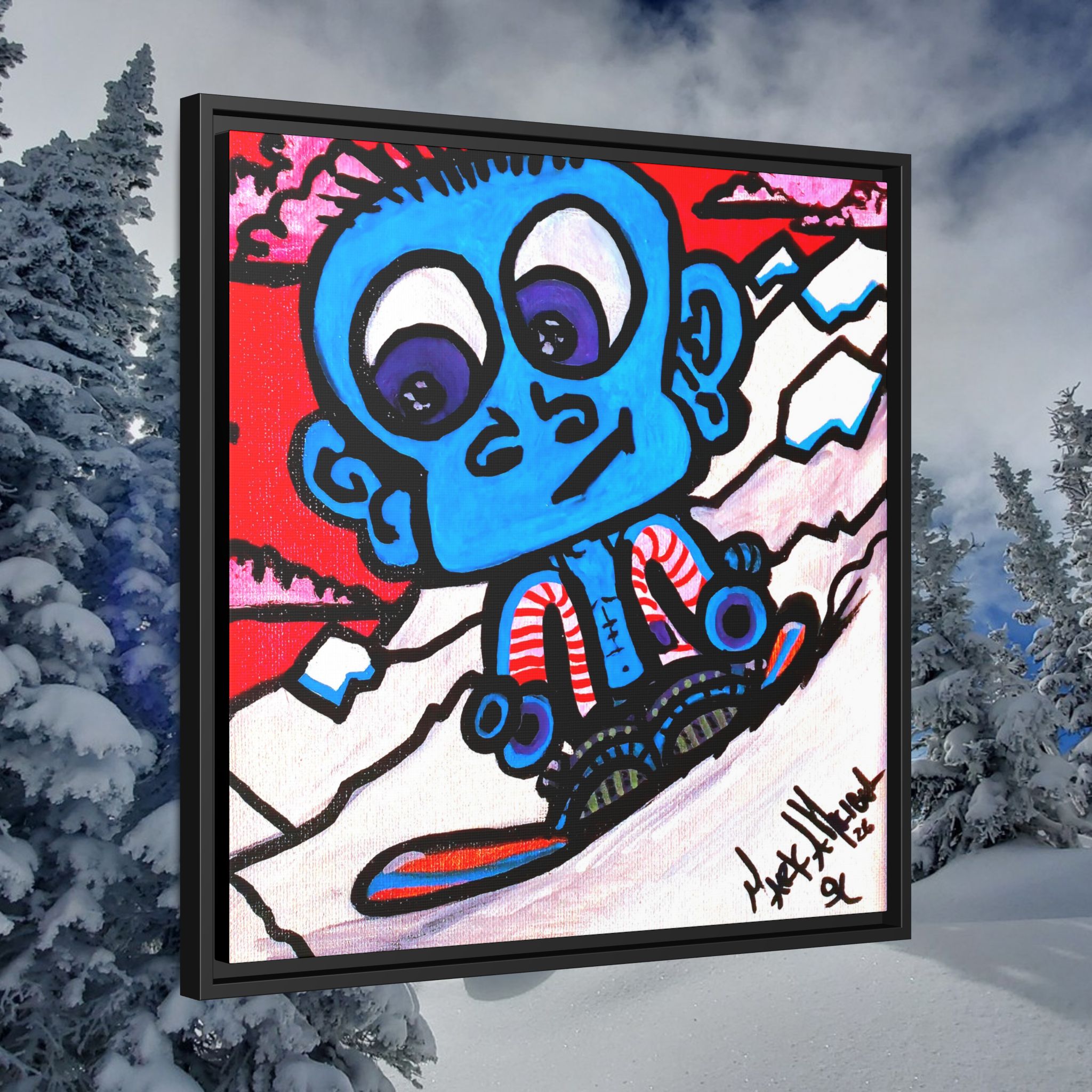 A vibrant matte canvas print framed in sleek pine, bursting with playful street-art energy. Bright, scratchy lines form a wide-eyed blue character carving through powdery slopes — color-rich reds, pinks and icy whites pop against the bold black outlines. Hung in a studio, cabin, or kid-friendly playroom, this piece brings a rush of youthful movement and wintertime mischief. The smooth matte finish cuts glare while preserving the hand-drawn texture, and the slender frame gives a contemporary gallery feel without stealing focus from the art.